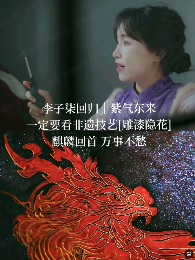 11月12日下午,全網(wǎng)粉絲過億的網(wǎng)紅李子柒在社交平臺發(fā)布了一則大漆作品制作的視頻。“漆”同“柒”,她給這幅雕漆隱花的漆器作品取名“紫氣東來”。