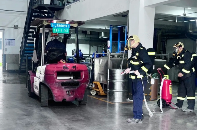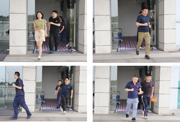 在生產(chǎn)車間,現(xiàn)場人員發(fā)現(xiàn)火情后,立即同步執(zhí)行“上報-撲救-疏散”動作,上報險情同時,使用就近滅火器進行初期滅火,傷員得到及時救助。在檢測樓區(qū)域,辦公室人員有序疏散,在全員默契配合下,所有人員安全疏散至集合點。