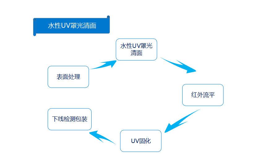 表面處理——水性UV罩光清面——紅外流平——UV固化——下線檢測(cè)包裝
