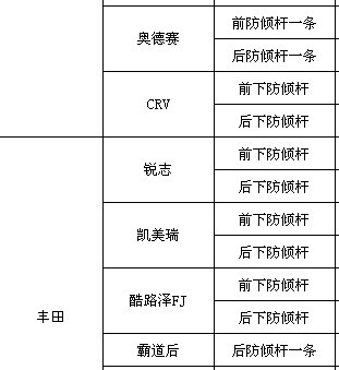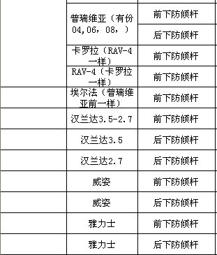 威姿防傾桿、雅力士防傾桿、花冠防傾桿、卡羅拉防傾桿、皇冠防傾桿、凱美瑞防傾桿、威馳防傾桿、銳志防傾桿、酷路澤防傾桿、霸道防傾桿、陸地巡航艦防傾桿、普拉多防傾桿、普瑞維亞防傾桿、大霸王防傾桿、RAV4防傾桿、埃爾法防傾桿、漢蘭達防傾桿、
