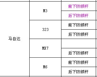 馬自達M2防傾桿、馬自達M3防傾桿、馬自達M5防傾桿、馬自達M5防傾桿、馬自達M8防傾桿、馬自達睿翼防傾桿、普力馬防傾桿、福美來防傾桿、CX-7防傾桿、