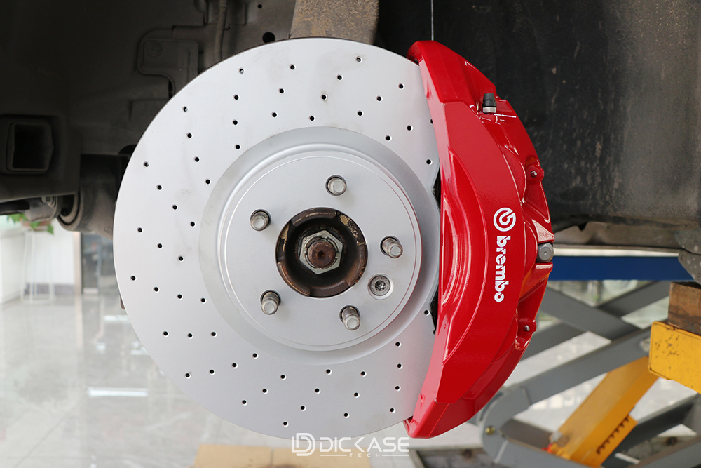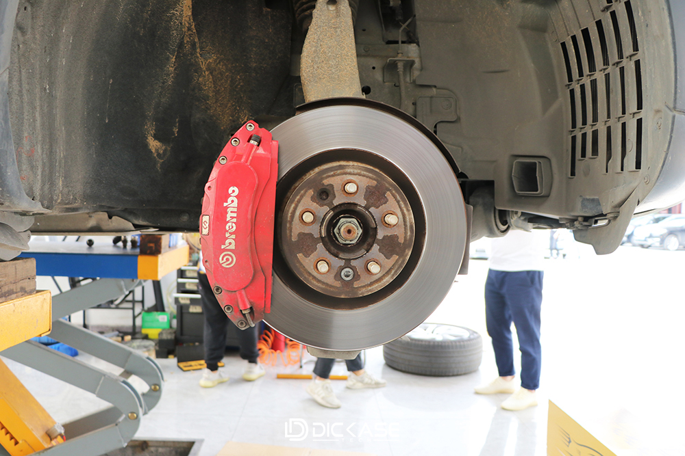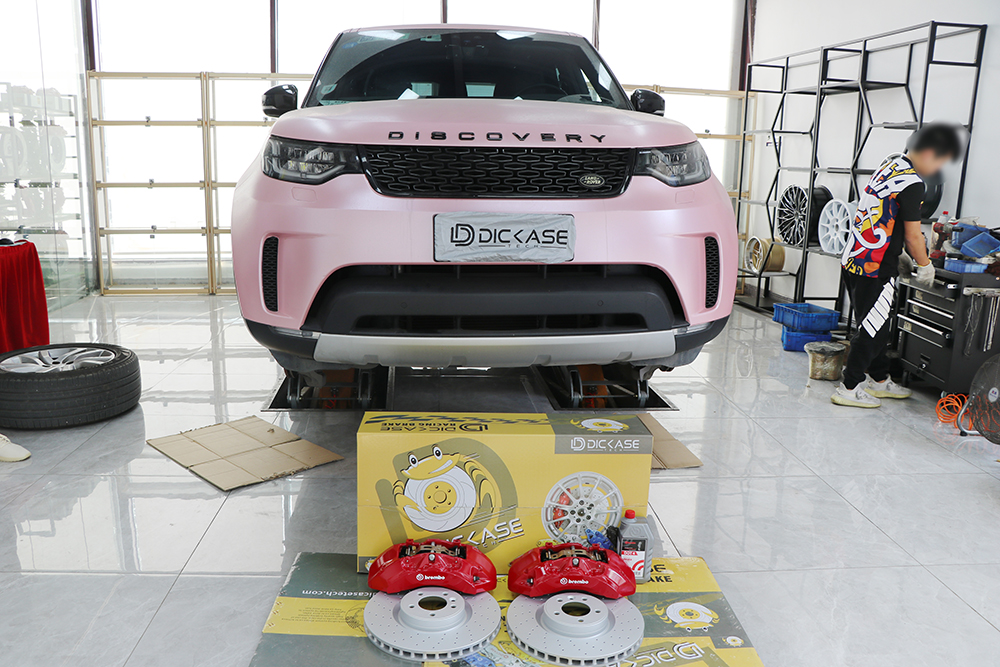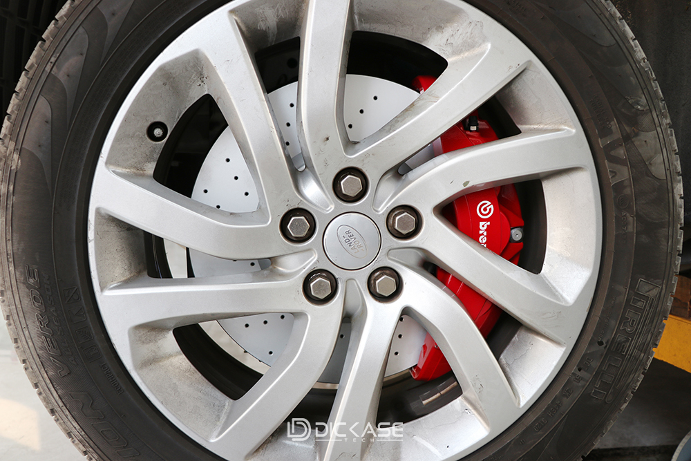 原車單向雙活塞卡鉗,但對于這么重的車來說,它的剎車力度還是有所欠缺的,所以我們給它升級一套Brembo專門為路虎定制的卡鉗路虎5.0。