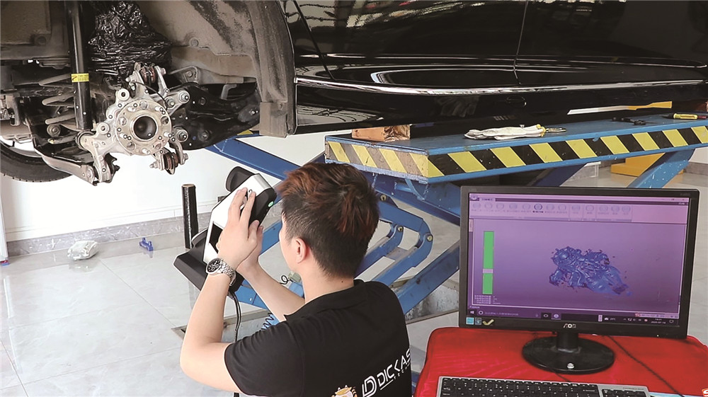 第二種方式是3D掃描采集數據,我們首先需要把輪轂拆下來,清理羊角。注意,羊角必須是安裝在車上,否則會丟失很多數據。接下來就可以開始掃描了,這個3D掃描儀器是靠這些激光的光束來測繪掃描這個羊角,這時候所獲得的數據是實時傳輸到電腦上形成初步圖形。