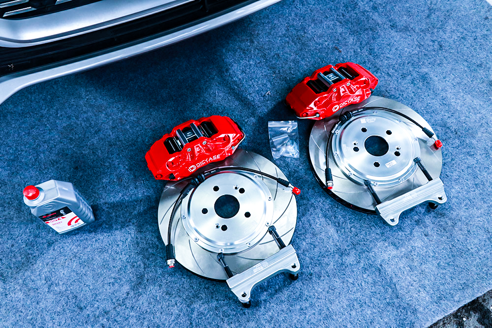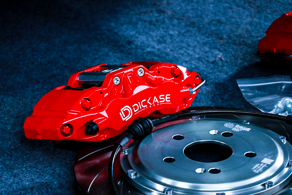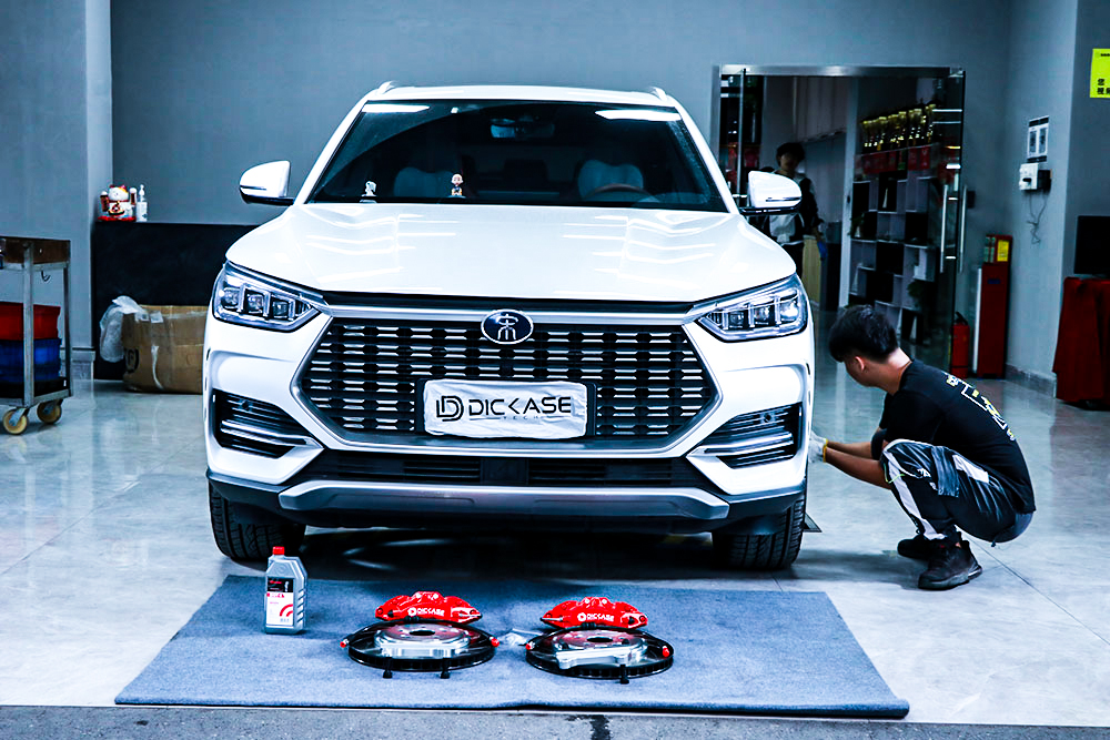 比亞迪宋plus升級迪卡司D61六活塞高性能版的卡鉗套裝,原車輪20寸,前輪升級DICASE D61分體鍛造的六活塞卡鉗,強度高,重量輕,不點頭,提升腳感舒適度